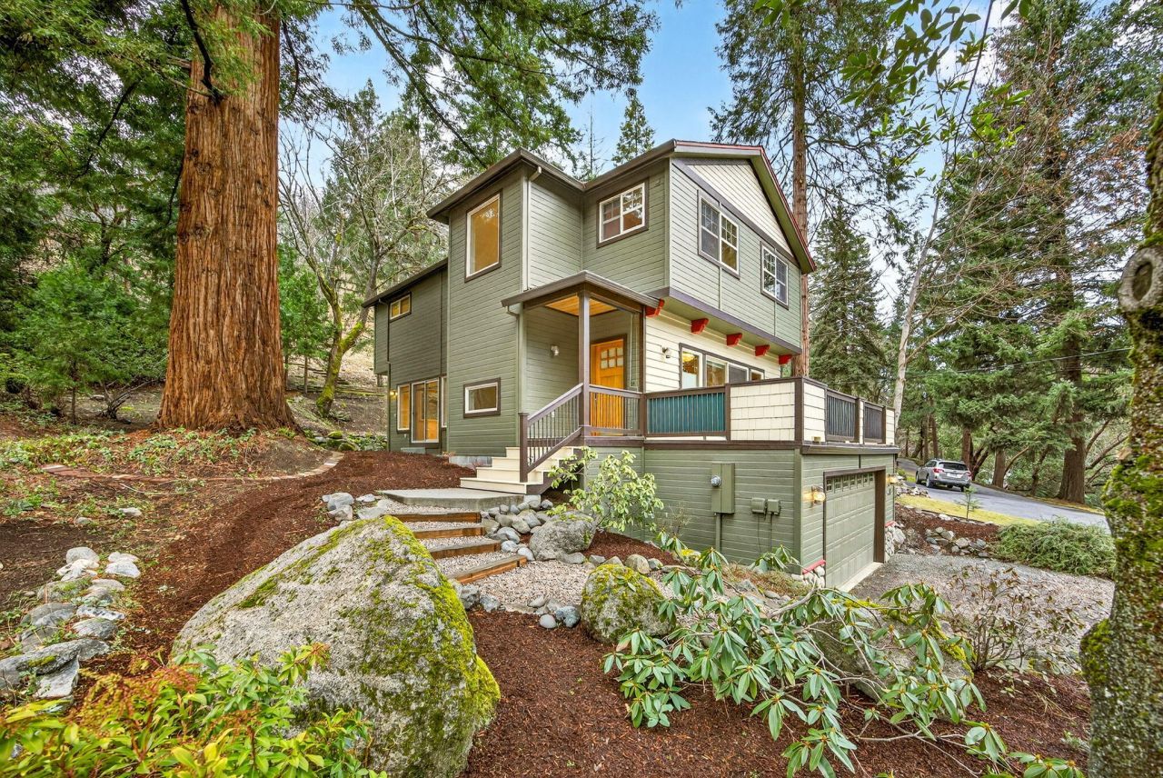 The location is perfect! Contemporary NW craftsman styled home with Lithia Park, Ashland Creek and trails across from your front door. Extensive updates include upgraded hardwood floors and high-end lighting upgrades by Julia Rezek LLC. The high ceilings, vaults and huge windows add to the light filled floor plan. A Jotul enamel gas stove and knotty pine built-in bookcases in the living room creates the ambiance of a retreat in the woods. The kitchen is large and includes a top-of-the-line range with two electric ovens & a five burner gas cooktop & lots of cabinet space. A large dining area off kitchen has slider to outside patio space. Spacious main level deck has privacy screening. Upstairs are spacious bedrooms and baths. The primary suite overlooks Lithia Park & has a sitting room/office and spacious bath. Home is upgraded with superior air filtration system and newer HVAC systems. Sloped back yard includes retaining walls and platform area with electric hookups for hot tub.